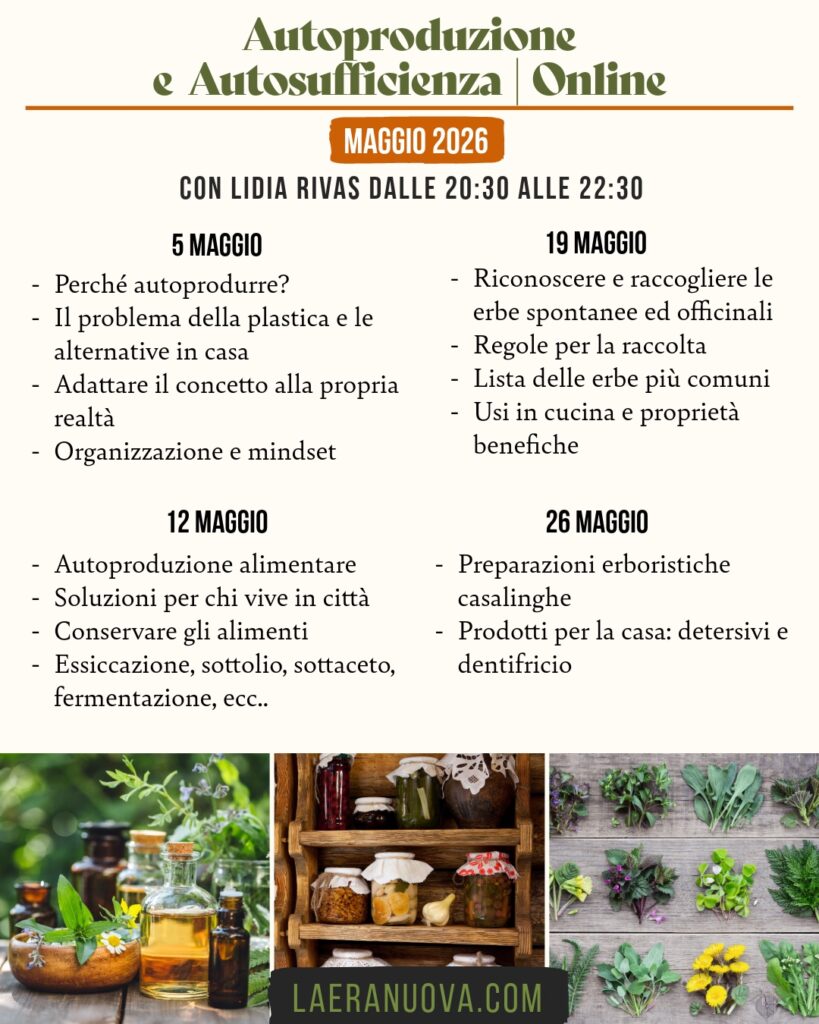 In questo percorso online ti guideremo alla scoperta di un nuovo modo di vivere, più consapevole e responsabile. Impareremo a ridurre la plastica producendo alimenti, prodotti per la casa e per la cura della persona. Scopriremo i segreti dell’orto e del giardino, con attenzione anche a chi vive in città. Esploreremo le tecniche per conservare alimenti di tua produzione e dei progetti di agricoltura che sostieni.